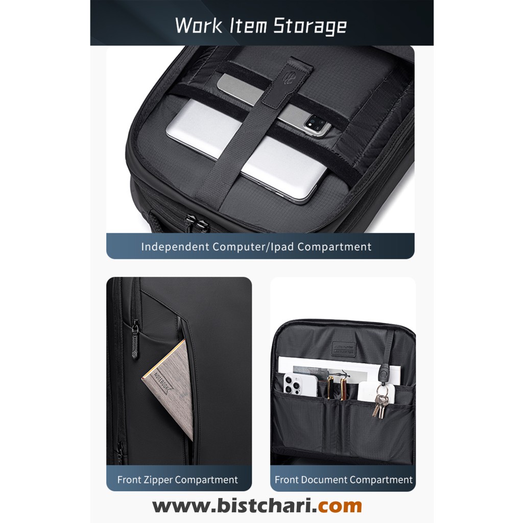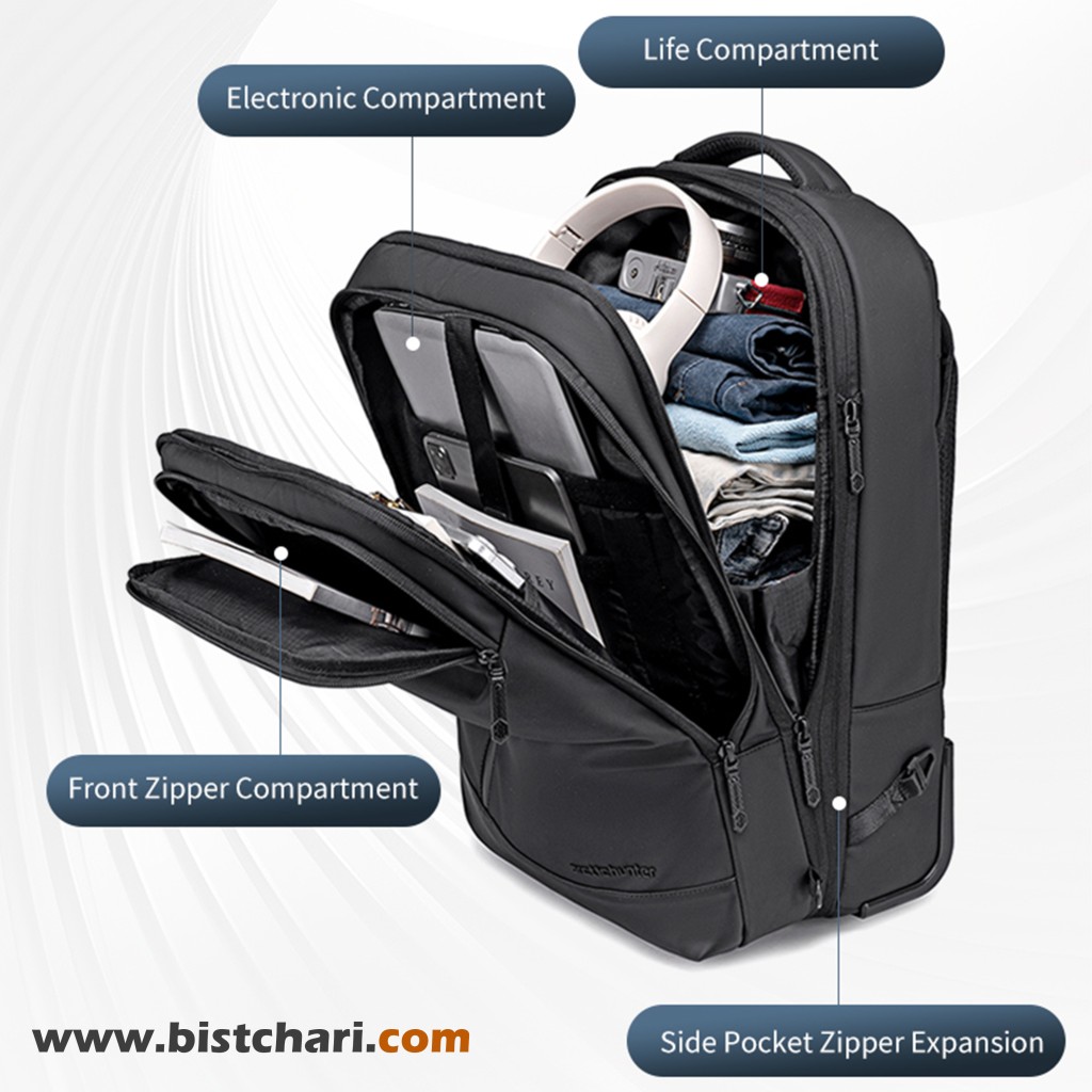 این کیف چرخدار دارای 4 محفظه زیپدار است که برای سازماندهی بهتر لوازم شما طراحی شدهاند. محفظه اصلی بهطور کامل باز میشود و قابلیت گسترش دارد. همچنین یک محفظه جداگانه برای لپتاپ، از دستگاه شما بهخوبی محافظت میکند. - قسمت پشتی دارای پارچه محافظ چرخ ها(زمانی که بعنوان کوله پشتی مورد استفاده قرار می گیرد)، پد تنفسی و طبی،محفظه ی مخصوص کارت شناسایی و گذرنامه،محفظه ی مخصوص پنهان نمودن بند های دوشی
