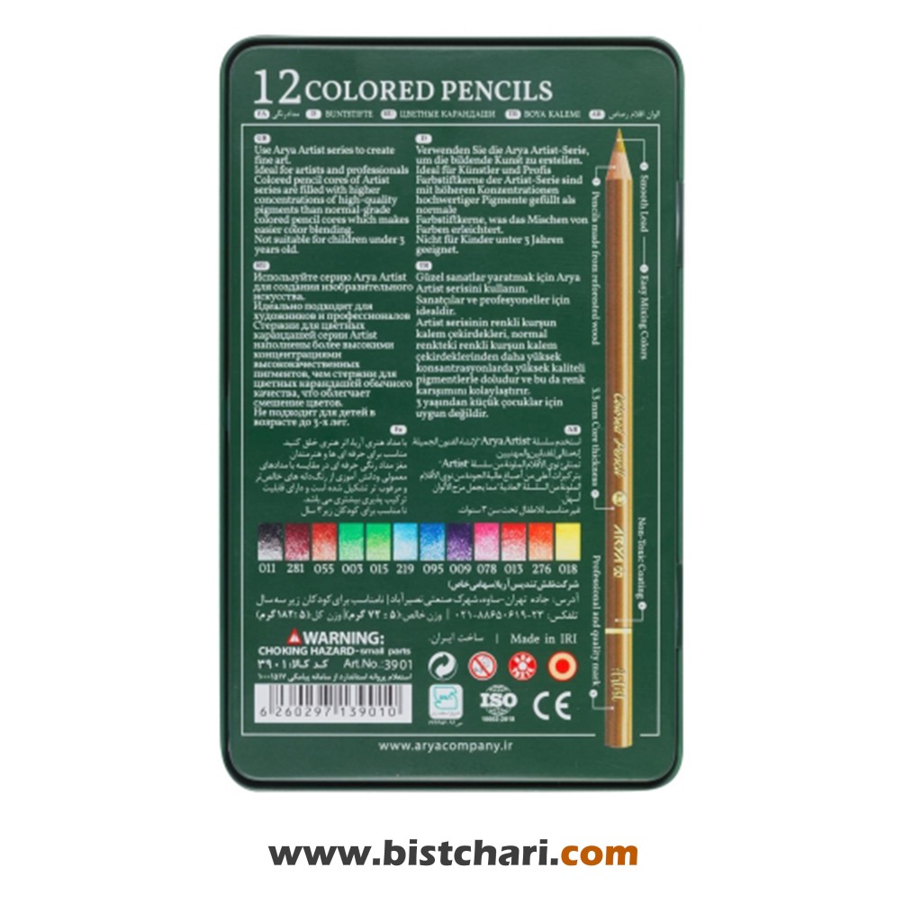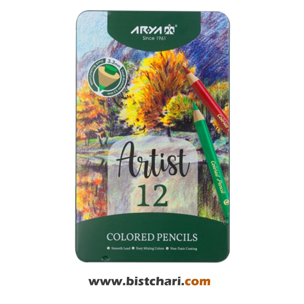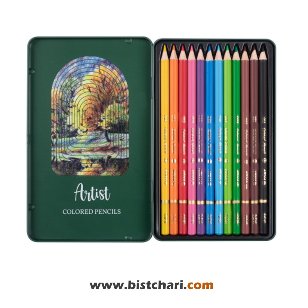 مداد رنگی 12 رنگ جعبه فلزی مدل Artist کد 3901 برند آریا Arya