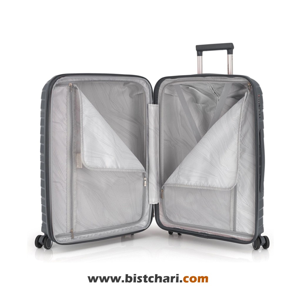 جنس چمدان KIBA پلی پروپیلن است که مقاومت بالایی به این چمدان داده. یکی از ویژگی های این چمدان پر فروش قابلیت افزایش فضای داخلی یا همان EXPAND است که توسط زیپ های