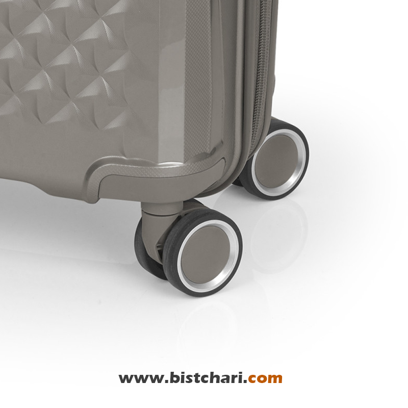 -چرخ های به کار رفته در چمدان جنس سخت Queens چرخ های دوبل هستند که قابلیت چرخش ۳۶۰ درجه دارند. این چرخ ها از جنس پلی اورتان ترموپلاستیک ساخته شده اند که با توجه به اینکه در دمای بالا تولید می شوند خاصیت ارتجاعی پیدا می کنند و در زمان جاجایی و حرکت چمدان صدایی تولید نمی کنند در در برابر تغییر دما و ضربه مقاومت بالایی دارند.